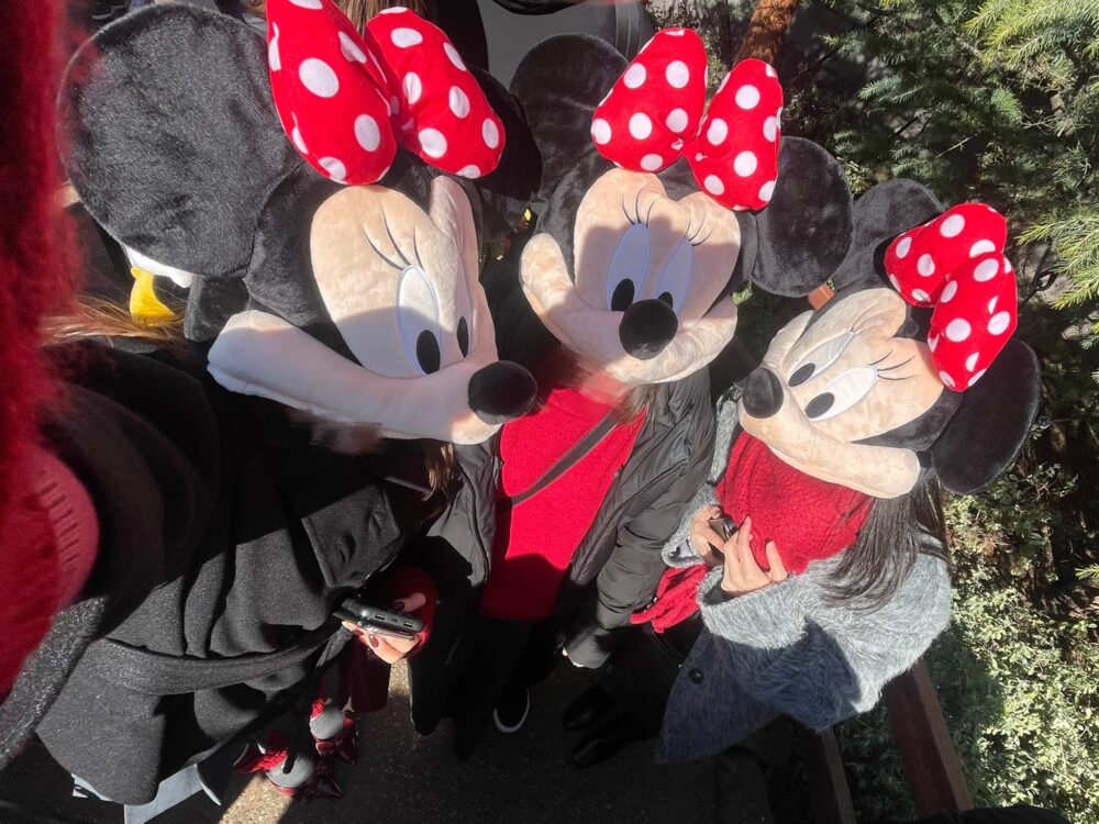 3人がミニーちゃんのかぶりものをしていたので、ミニーちゃんが手を振ってくれて、大興奮です🎀